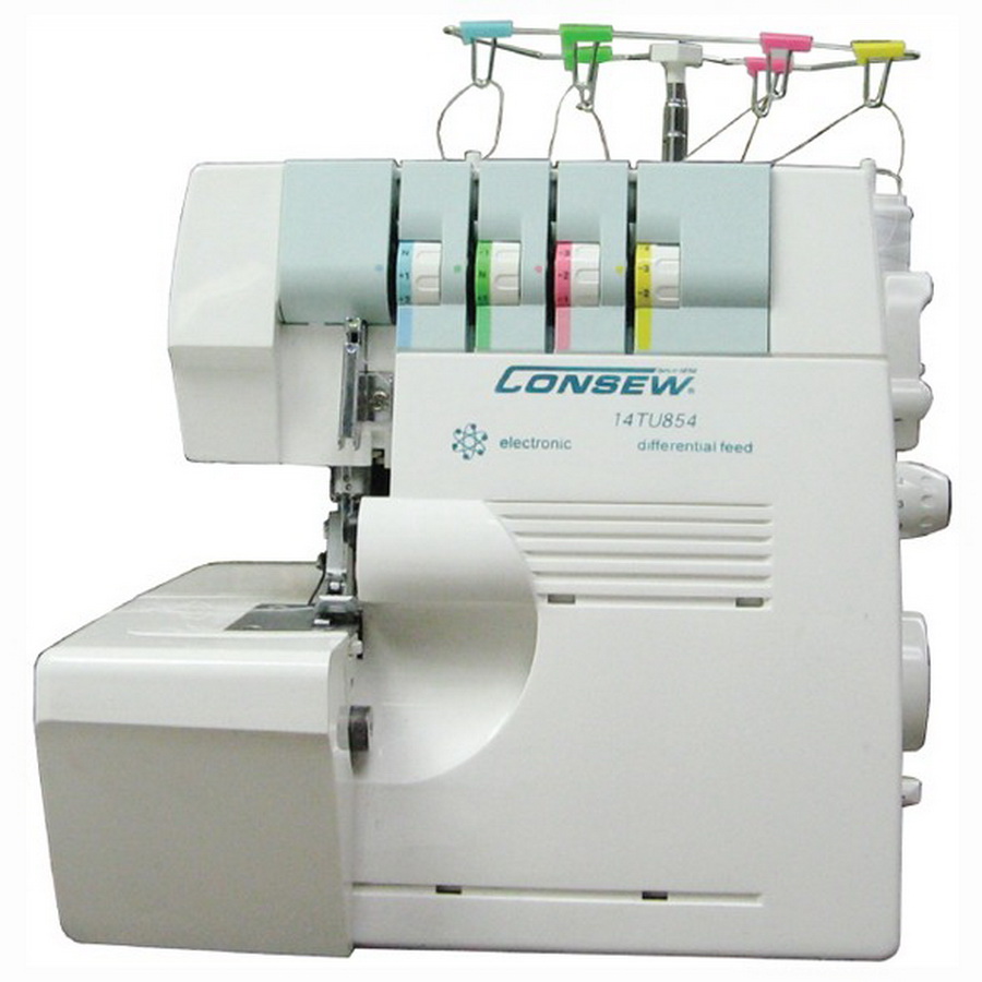 Loading... Please wait...The Consew 14TU854 is a portable, Multi-Function, Overlock Stitch Machine, 4 Thread, 2 Needle (Mock Safety Stich), Differential Feed, Easy color coded threading, Adjustable stitch length dial, Equipped with built-in motor, Electronic Foot-Pedal, Built-in LED sew light, Safety Shut-Off Switch