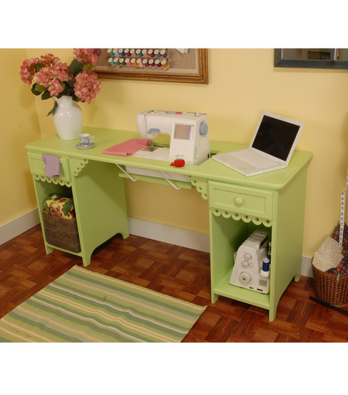 Loading... Please wait...Featuring a cute vintage gingerbread design, the Olivia Sewing Cabinet will become the focal point of any sewing room. It has a durable design with composite construction and a vinyl laminate top. The simple 2-position mechanism allows you to sew flatbed or free-arm at any height. Pull the quick release lever forward to make your sewing well become flush with the top and use Olivia as a desk or another hobby table. You'll find plenty of room with two drawers for smaller sewing notions and 2 large cubbies for storage of your sewing machine and serger.